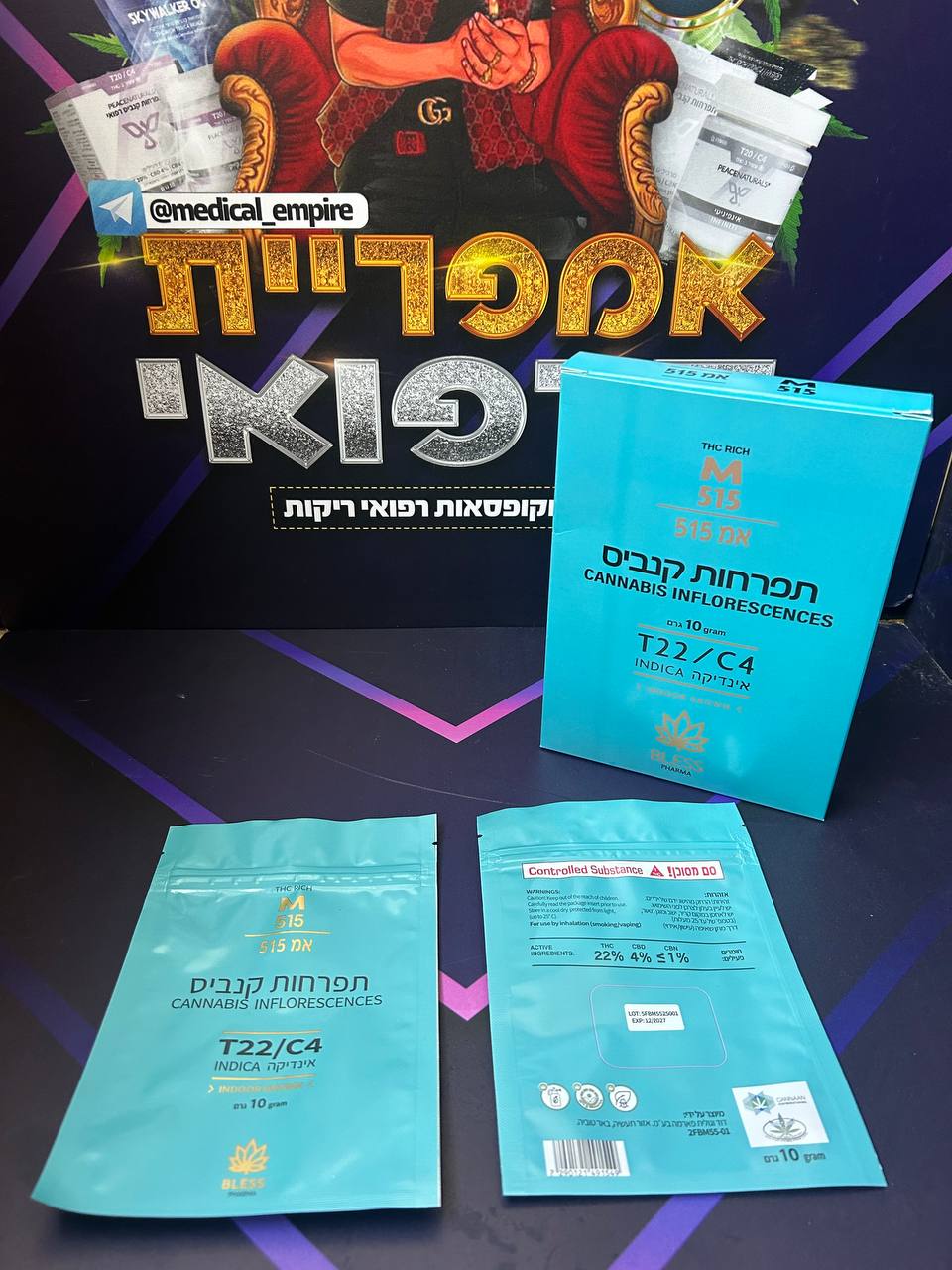 אמ 515 (M515) – תפרחת קנאביס, מאפיון אינדיקה, מקטגוריית מינון T22/C4. אמ 515 (M515) משווק על ידי בלס פארמה תחת המותג בלס פארמה באריזת שקית. סיפורו הגנטי של אמ 515 (M515) מתחיל בזן המקור מירקל אליאן קוקיז – מאק, אשר נוצר מהכלאת הזנים אליאן קוקיז עם סטארפייטר × קולומביאן גולד. פרופיל הקנבינואידים כולל ריכוז THC של 24.2% – 19.9% ו-CBD של 4% – 0%.